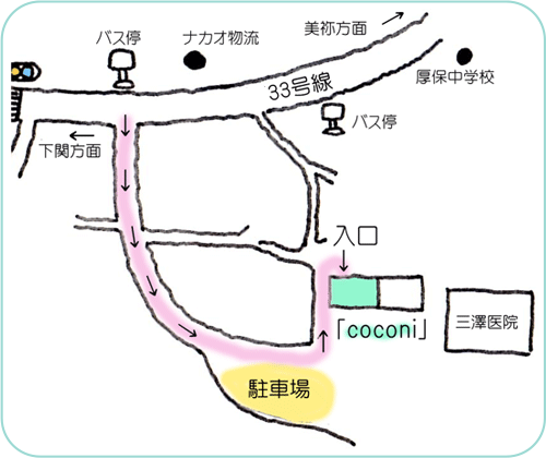 - 「coconi」は三澤医院の横、畑のところにあります。入口は裏側にありますのでレンガの小道を通ってきてくださいね。